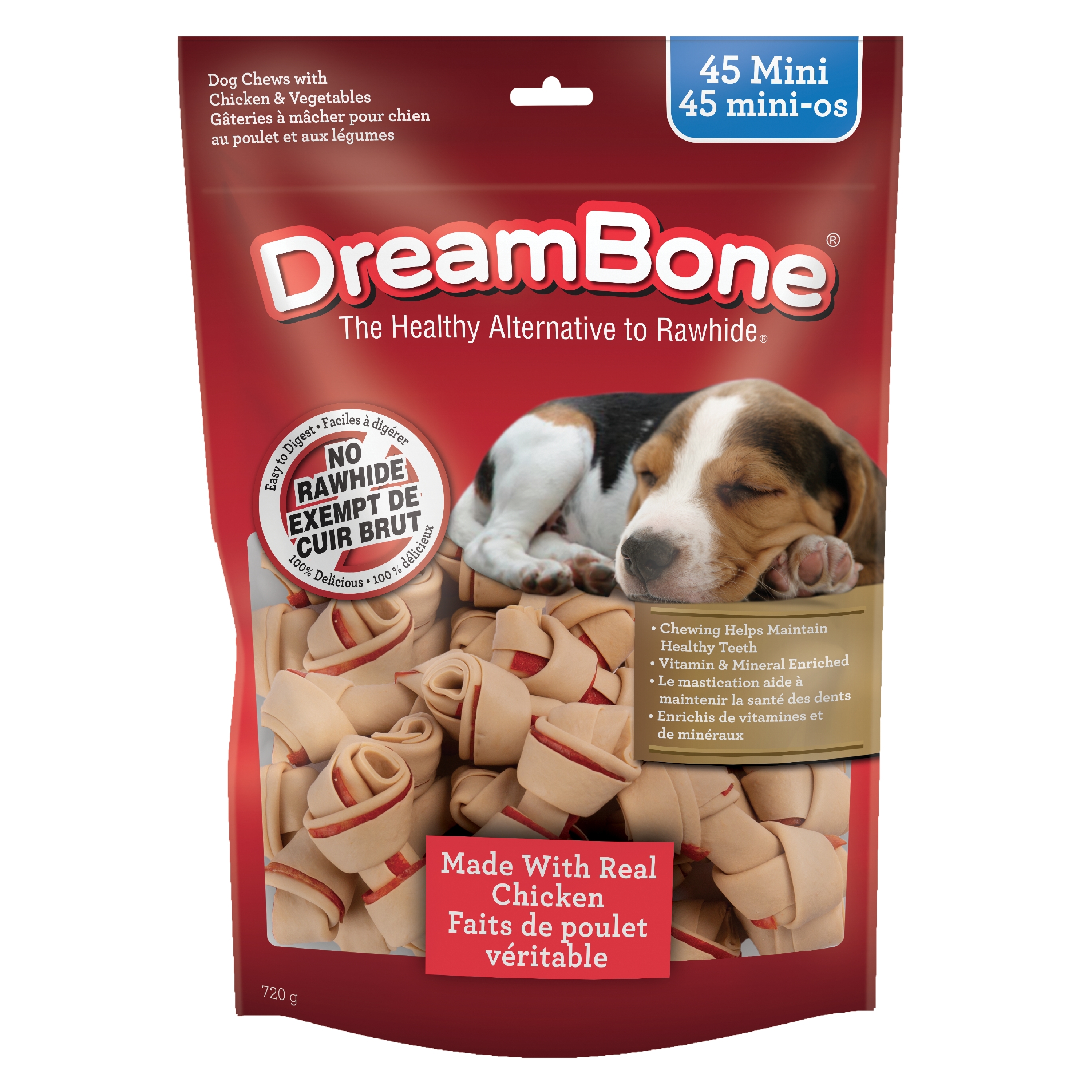 Amidon de maïs, glycérine, poulet, sorbitol, farine de pois, fructose, maltodextrine, gélatine, sirop de malt d’orge, sel, arôme artificiel de poulet, dioxyde de titane (colorant), arôme artificiel de lait, carottes déshydratées, patates sucrées déshydratées, carraghénane, phosphate dicalcique, pyrophosphate de sodium, sorbate de potassium (agent de conservation), propionate de sodium (agent de conservation), tripolyphosphate de sodium, pantothénate de D-calcium, supplément de vitamine E, sulfate de fer, sulfatede manganèse, sulfate de zinc, chlorhydrate de pyridoxine, chlorhydrate de thiamine, niacinamide, FD&C rouge no 40, supplément de vitamine B12, supplément de riboflavine.
