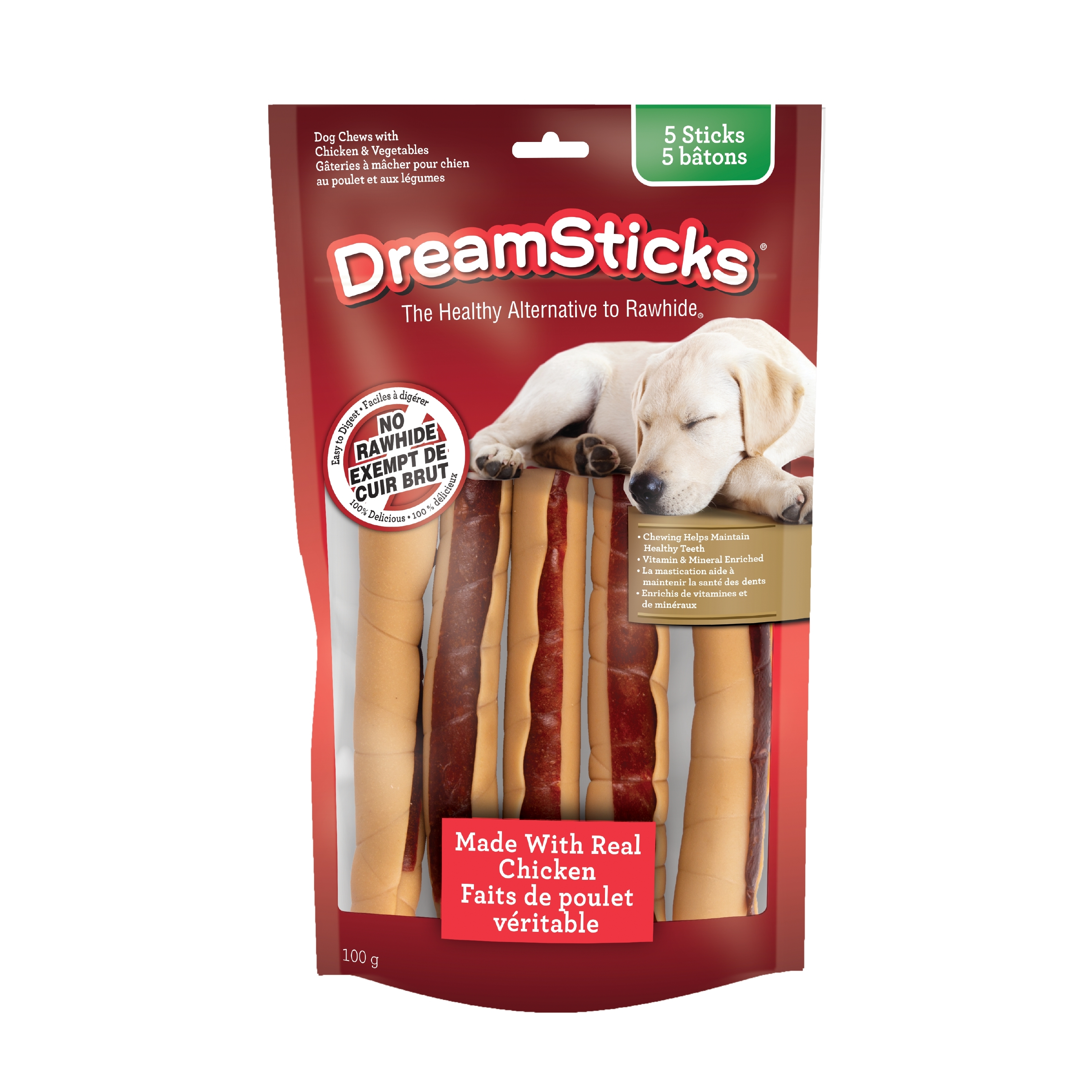 Maïs, poulet, glycérine, sorbitol, fructose, maltodextrine, sirop de malt d’orge, gélatine, sel, arômes naturels et artificiels, dioxyde de titane, patates douces, pois, carottes, gomme xanthane, phosphate dicalcique, pyrophosphate de sodium, sorbate de potassium (agent de conservation), propionate de sodium (agent de conservation), tripolyphosphate de sodium, pantothénate de D-calcium, supplément de vitamine E, chlorhydrate de pyridoxine, chlorhydrate de thiamine, sulfate ferreux, sulfate de manganèse, sulfate de zinc, huile de graine de persil, bicarbonate de soude, varech séché (source naturelle de chlorophylle), niacinamide, supplément de vitamine B12, luzerne (source naturelle de chlorophylle), supplément de riboflavine.